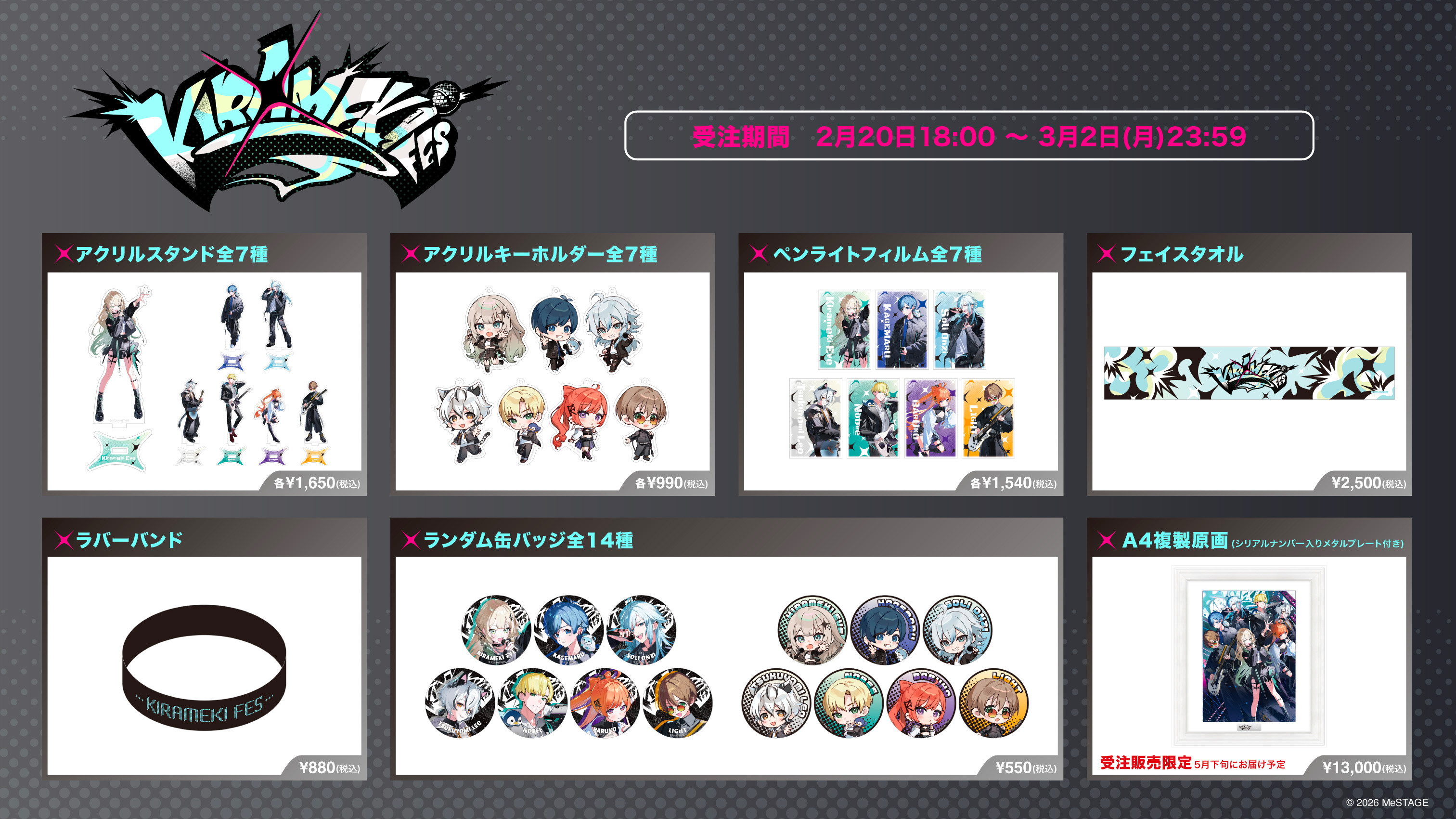 ■グッズ購入特典「KIRAMEKI FES」ライブグッズを税込5,000円以上お買い上げごとに『ライブKVポストカード』をプレゼント!※送料除く税込5,000円ごとに1枚お渡しとなります。上限枚数はございません。※1回のご注文に対しての金額となります。他注文との金額合算不可。