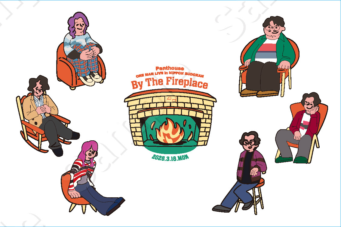 Penthouse ONE MAN LIVE in 日本武道館 “By The Fireplace” オフィシャルTシャツ。フロントデザインにはお馴染みのPHロゴ、バックデザインには歌詞「Give yourself to the 60’s played on the radio」からインスパイアされたラジオのモチーフをレイアウト。2色展開、刺繍オリジナルタグ付き。