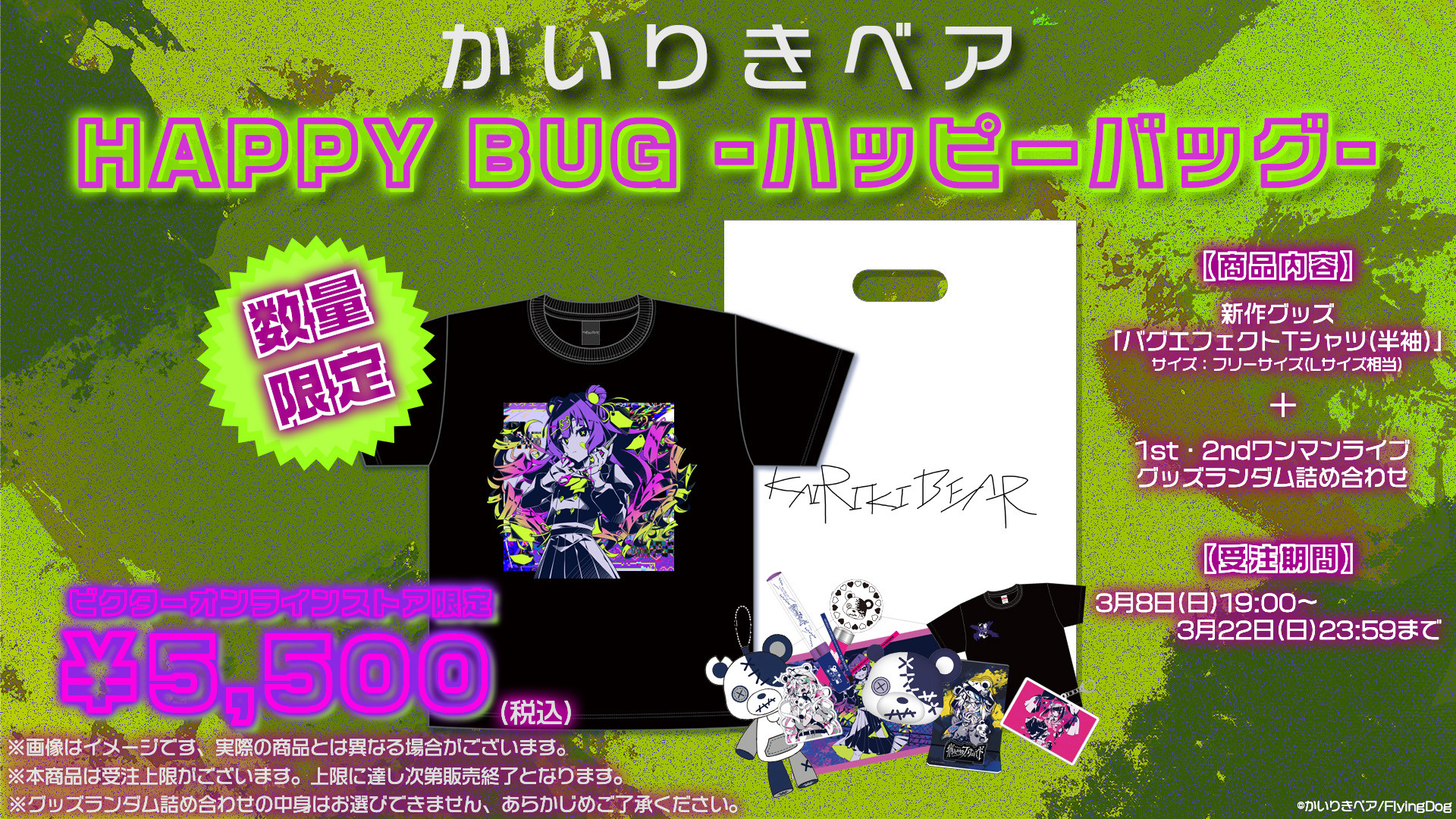 描き下ろしの「バグ」イラストを使用した新グッズ「バグエフェクトTシャツ(半袖)」に加え、1st・2ndワンマンライブのグッズをランダムで詰め合わせにした、数量限定の豪華なハッピーバッグとなっています!