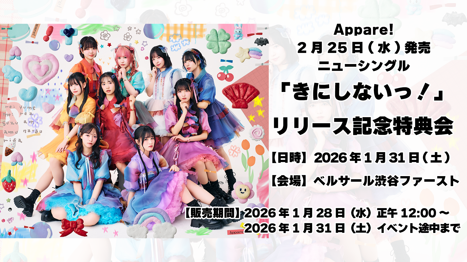 Appare!のニューシングル「きにしないっ!」のリリースを記念して、1/31(土)にベルサール渋谷ファースト2Fにて特典会の開催が決定致しました!ぜひ奮ってご参加ください!
