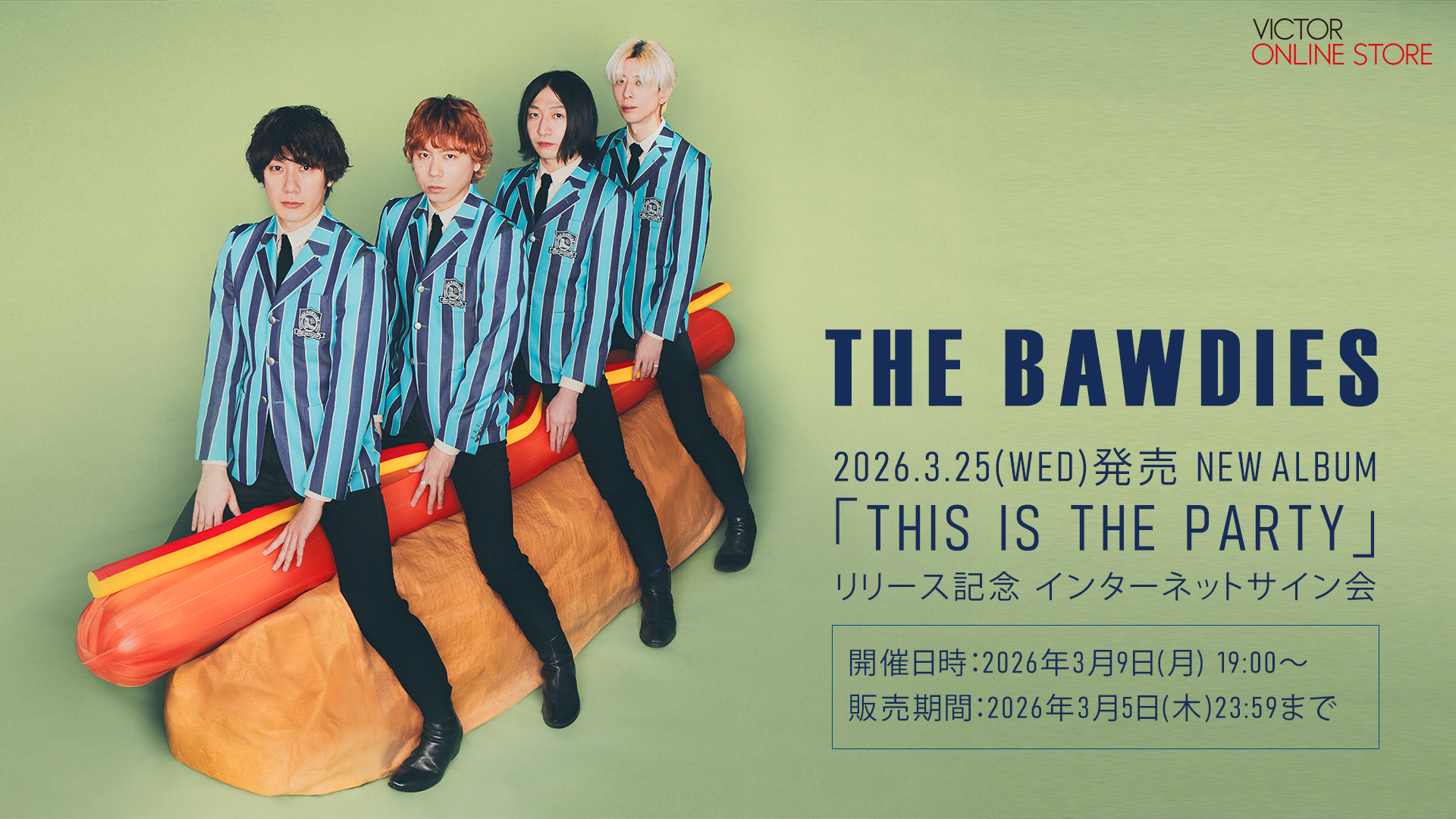 2026年3月25日発売ALBUM「THIS IS THE PARTY」のリリースを記念し、インターネットサイン会の開催が決定いたしました。対象注文期間中にVICTOR ONLINE STOREにてイベント対象カートより対象商品をご予約いただいた方に直筆サイン入りA2ポスターをプレゼントいたします。A2ポスターにはお名前(ニックネーム)を入れさせていただきます。また、その模様をYouTube Liveにて生配信し、お客様のお名前(ニックネーム)を本人よりお呼びいたします。(メンバーの指定はできません。)