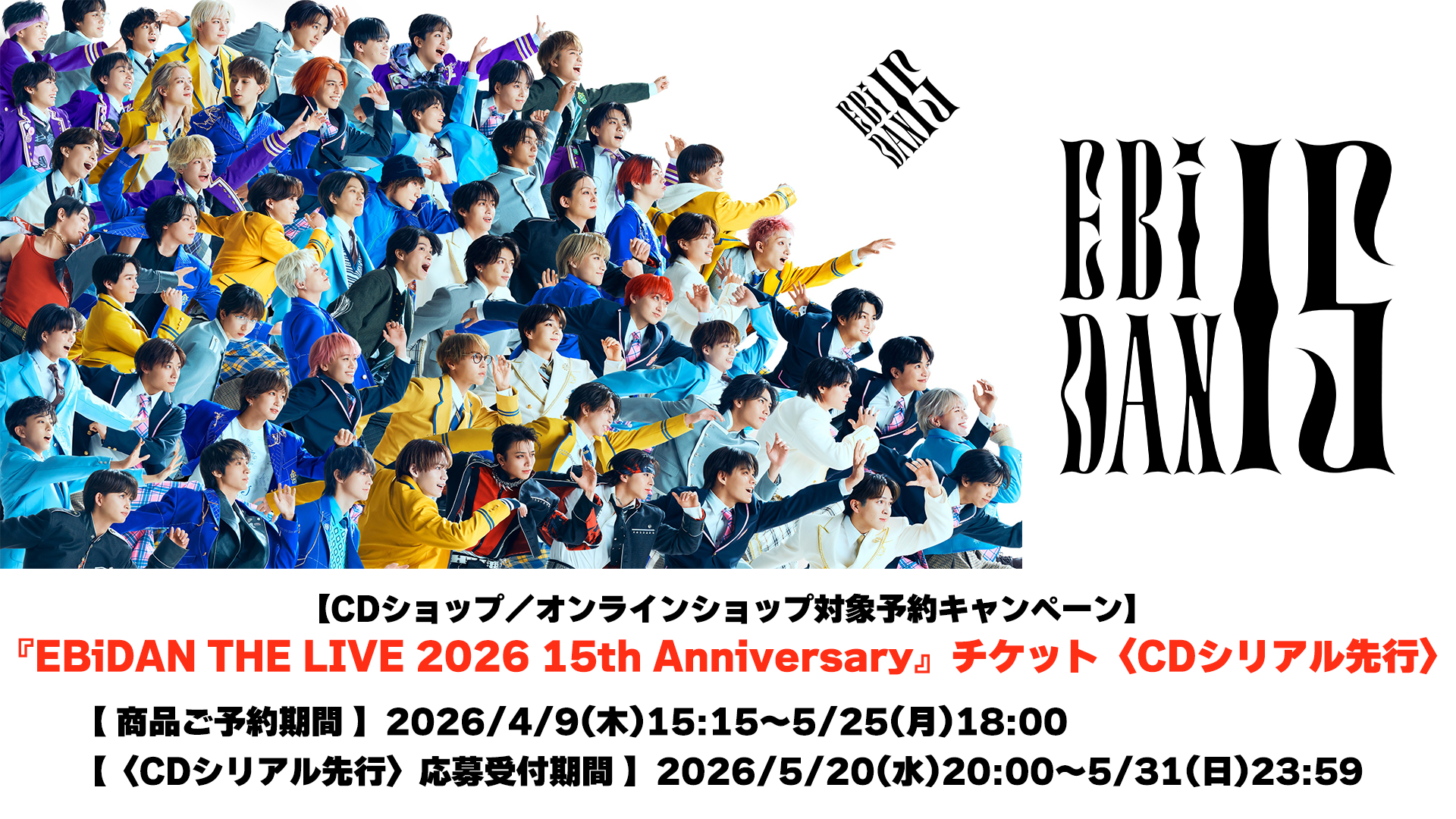 「シリアルナンバー」をお持ちの方は、本ナンバーをお持ちの方を対象とした『EBiDAN THE LIVE 2026 15th Anniversary』チケットのCDシリアル先行(抽選)にご応募いただけます。