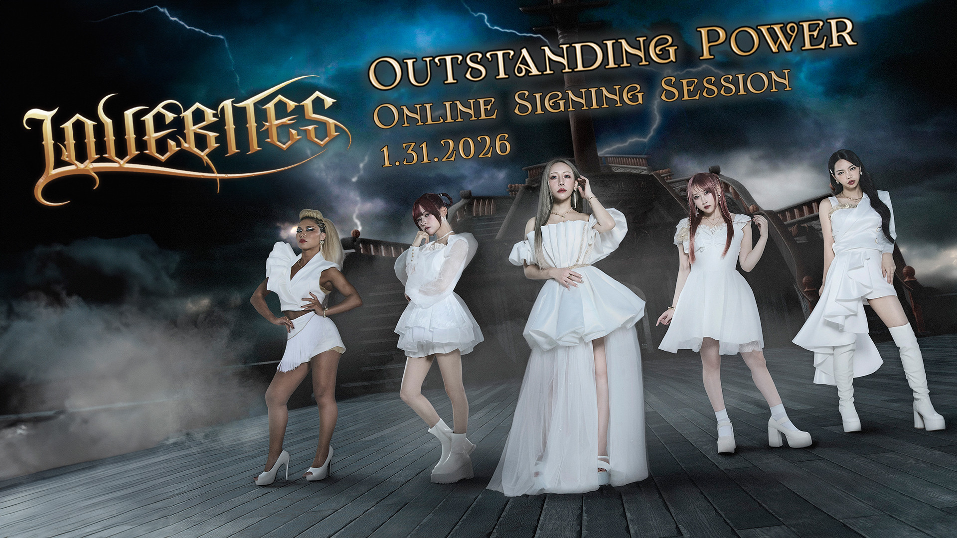 定められた特典付与期間中に、VICTOR ONLINE STOREにて対象商品をご購入くださったお客様の中から抽選で、LOVEBITESメンバー全員の直筆サインを入れた「『OUTSTANDING POWER』特製紙ジャケットスリーヴ」をプレゼントいたします。また、スリーヴにバンドがサインをしている模様を、YouTubeライブで生配信いたします。その際ご当選者様のお名前(ニックネーム)をメンバーがお呼びいたします。紙ジャケットスリーヴには宛名の記入はいたしません。メンバーのサインのみとなります。