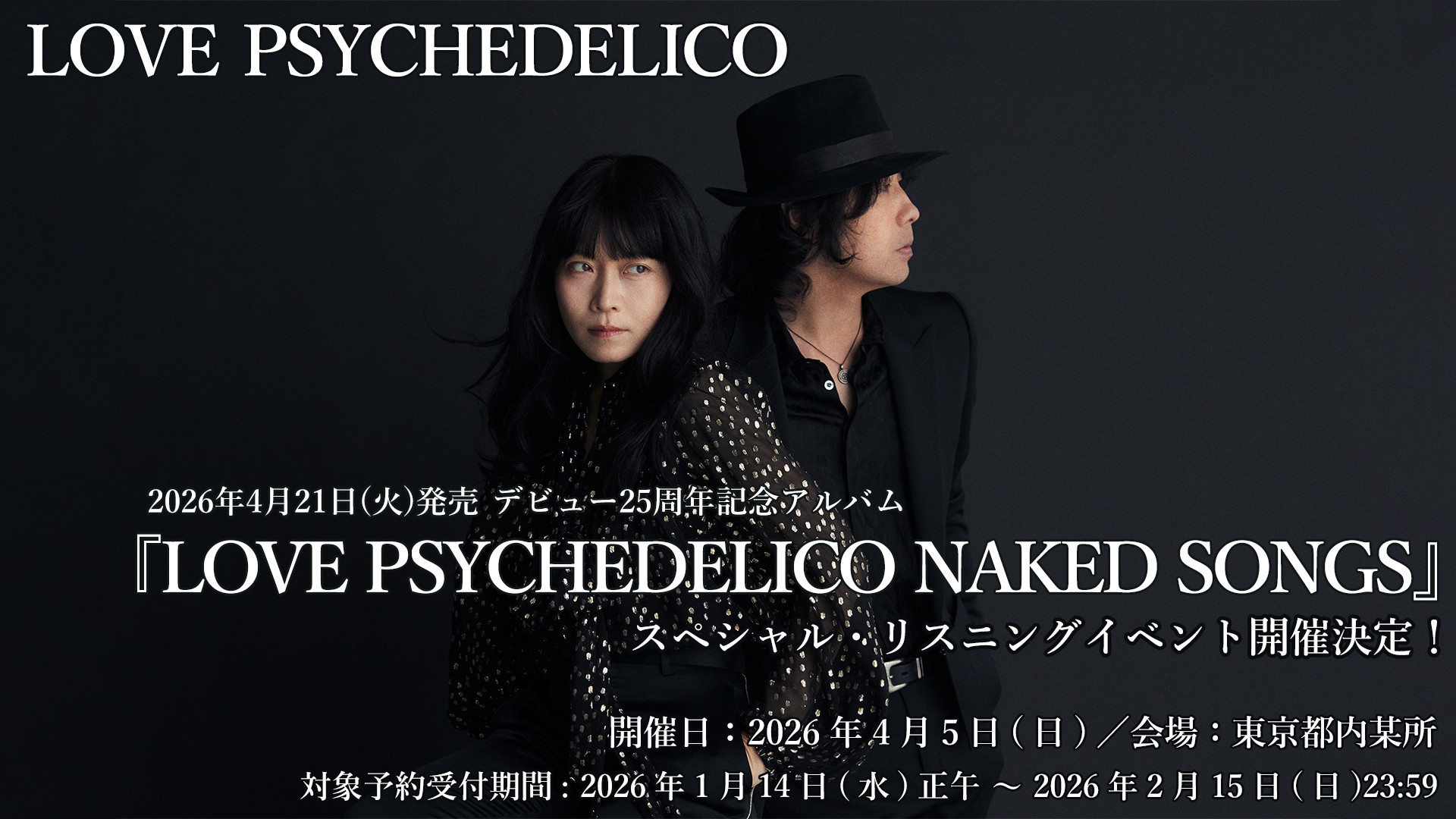 VICTOR ONLINE STORE にて限定販売される、2026年4月21日(火)発売「LOVE PSYCHEDELICO NAKED SONGS Special Box」をご予約いただいた方から、抽選で50名様を、セルフリミックスを行ったメンバー・NAOKI参加の上、本作をひも解く「LOVE PSYCHEDELICO NAKED SONGS スペシャル・リスニングイベント」にご招待いたします。なお、ご応募いただい方へ、もれなくオリジナルステッカーをプレゼント!ぜひ奮ってご予約ください!