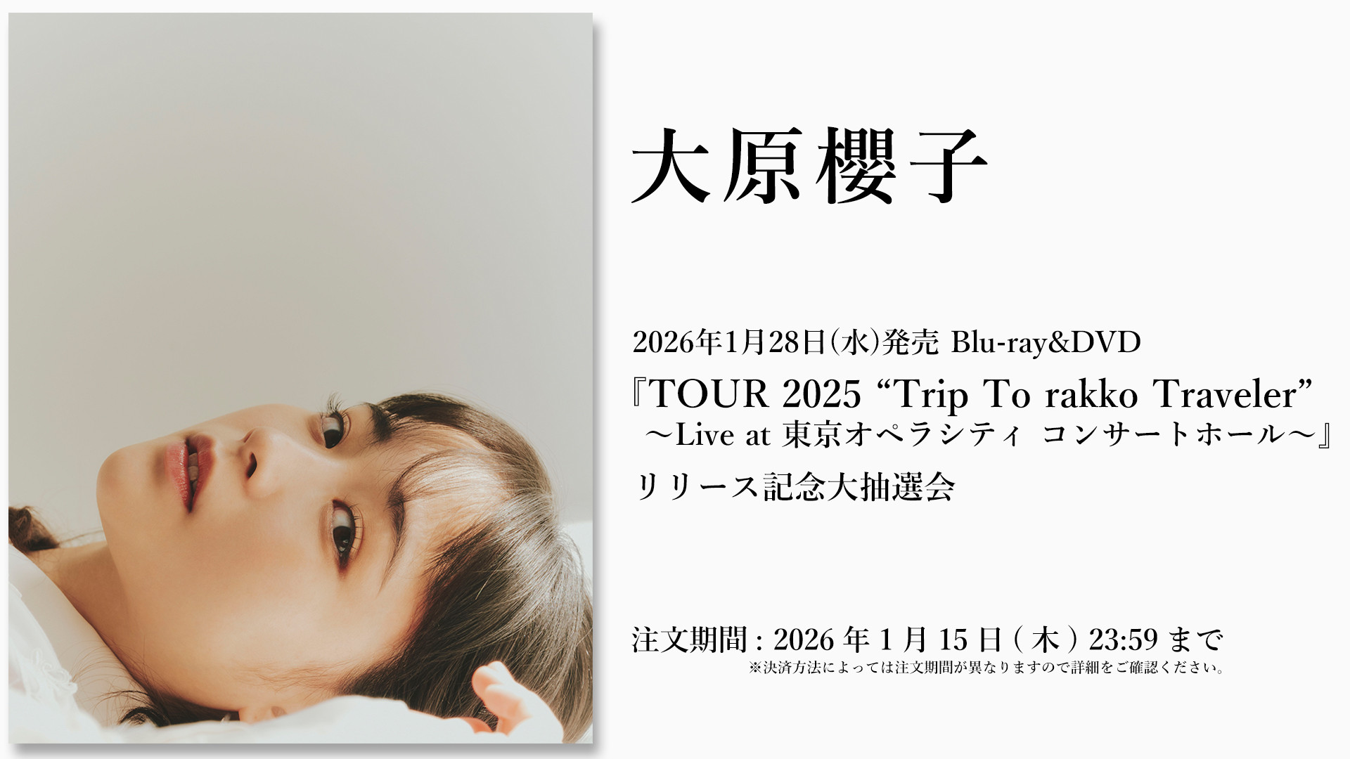 大原櫻子 2026年1月28日発売 Blu-ray&DVD「TOUR 2025 “Trip To rakko Traveler”~Live at 東京オペラシティ コンサートホール~」を【大抽選会】専用カートより新規でご注文いただいた方が、リリース記念の大抽選会にご参加いただけます。